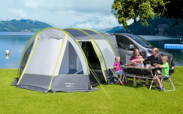 Das Berger Touring Busvorzelt eignet sich für Fahrzeuge mit einer Regenrinnenhöhe von 180 – 220 cm. Die Gesamthöhe des Zeltes beträgt 205 cm.
