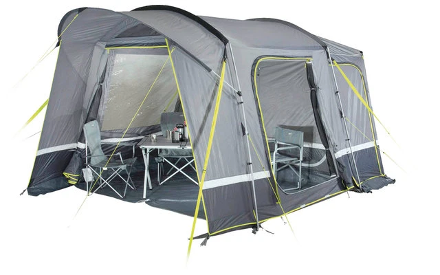 Freistehendes „Drive Away“ Tunnel Busvorzelt in Steilwand-Konstruktion.