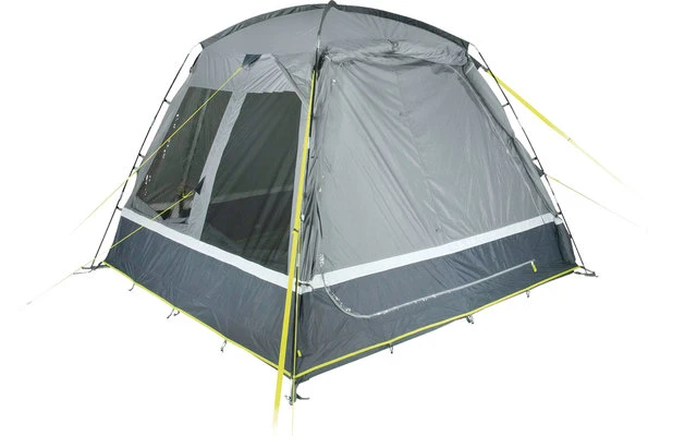 Die rechten Seitenwände bieten ein optimales Raumgefühl. 3 Dachstützgestänge stabilisieren das Zelt. Das Vordach mit Wetterblenden schützt vor Wind, Regen und bietet Schatten. Der fest vernähte Boden mit dem Außenzelt verhindert das Eindringen von Schmutz, Nässe, Krabbeltieren und schützt vor Zugluft. Die Verandafront lässt sich je nach Wetterlage bis zur Mitte oder ganz öffnen. Die Bodenwanne kann an der Front herunter geklappt werden und verhindert Stolperfallen. Gazefenster aus extra starkem, reißfestem 150D „Superfine“ Moskitonetz belüftet den Wohnbereich und halten Insekten aus dem Zelt fern. Die innenliegende Reißverschluss Fensterklappe ist einfach zu bedienen und wird variabel als Dauerventilation eingesetzt. Gaze-Seitentür aus 150D „Superfine“ Moskitonetz für mehr Bewegungsfreiheit und Belüftung. 2 Klarsichtfolienfenster mit innenliegenden Reißverschluss- Fensterklappen können einfach und variabel bedient werden. Eine Hochentlüftung belüftet das Zelt an regnerischen Tagen.