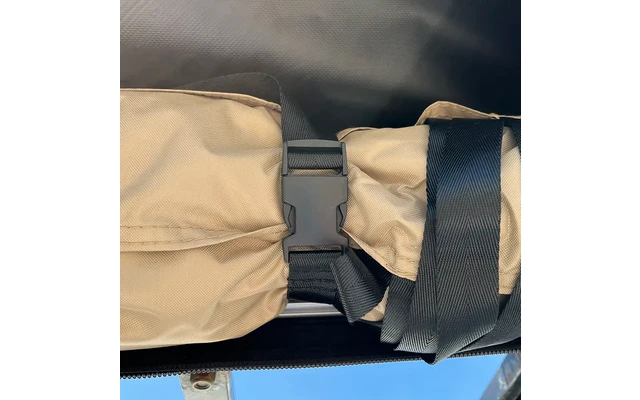 Sobald die Basis am Fahrzeug befestigt ist, kann die Höhe der Kabine mit Hilfe der Begrenzungsbänder (je nach Größe des Fahrzeugs) eingestellt werden, um zu verhindern, dass der Stoff unnötig am Boden reibt und schmutzig oder beschädigt wird.