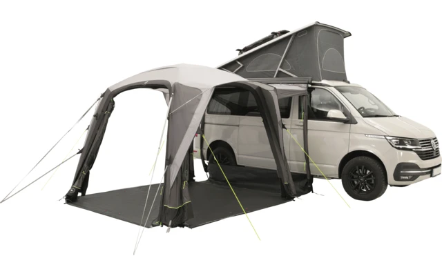 Das aufblasbare Bremburg Air ist ein kompaktes Busvorzelt, das seitlich und somit parallel zum Bus aufgebaut wird. Der Aufbau gelingt in wenigen Minuten und die Luftschläuche werden nur über ein Ventil mit der mitgelieferten Pumpe schnell aufgeblasen. Alle drei Seiten sind komplett zu öffnen und haben eine zusätzliche Insektennetztür, die sich unten auch über Zipper mit dem durchgehenden Boden schließen lässt. Außerdem sind die Front- und Heckseite durch ein Regen-Vordach geschützt, wodurch man je nach Platz- und Wetterverhältnis sich seinen Lieblingsausgang aussuchen kann, auch super nutzbar bei einer Bus-Heckküche. In der Verbindungsschleuse, die das Zelt mit dem Bus über das Doppel-Kederprofil oder Leinen verbindet, sind zwei weitere Türen, die Ihnen bei Schlechtwetter einen guten Eintritt zum Bus oder Zelt bieten. Eine zusätzliche Bodenplane inklusive Windschürze ist hierfür im Lieferumfang. Eine Schlafkabine für 2 Personen ist optional erhältlich und kann abends in wenigen Sekunden eingehängt werden. Natürlich kann auch dieses Busvorzelt komplett geschlossen werden und es kann am Platz zurückgelassen werden.