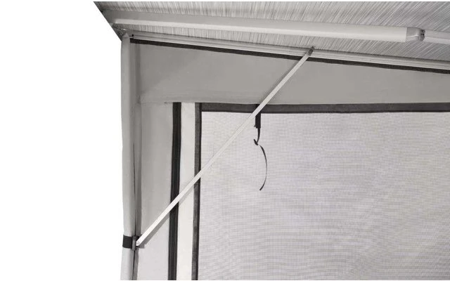 Perfekte Dachabdichtung dank Klemmprofilen für das Anbringen der Seitenwände und deren Verbindung mit dem Markisenstoff. Vorder- und Seitenwände sind mit schwarzen Doppelprofilen für optimalen Verschluss versehen.. Die Vorderwand besitzt eine Türöffnung rechts, die praktisch hochgerollt werden kann. Schaumstoffstreifen für winddichte Passung an der Fahrzeugwand. Große Fensterflächen lassen viel Licht herein und vermitteln ein richtiges Draußengefühl. Beide Seiten und die Vorderwand bestehen aus hochwertigem Polychlorid-Material. Weiteres Zubehör kann an der Keder-Schiene an der Vorderwand des Zelts angebracht werden. Eine Bodenschürze zur Abdichtung Ihres Fahrzeugbodens gehört zum Lieferumfang.